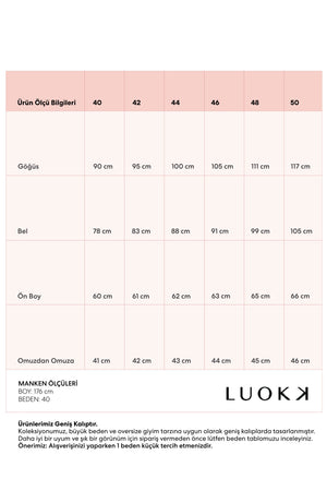 | Ürün Ölçü Bilgileri | 40 | 42 | 44 | 46 | 48 | 50 |