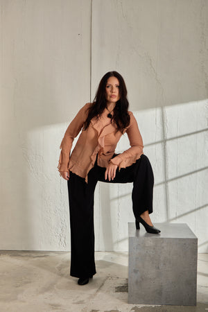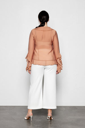 Designed for special occasions or elevated everyday looks, the ALLEIA Semi-Sheer Plus Size Brown Blouse stands out among elegant plus size dressy blouses with its refined details. The V-neckline and ruffle accents add movement and charm to the design, while the slit detail on the sleeves offers a modern touch. The buttoned front creates a classic and sophisticated appearance.
