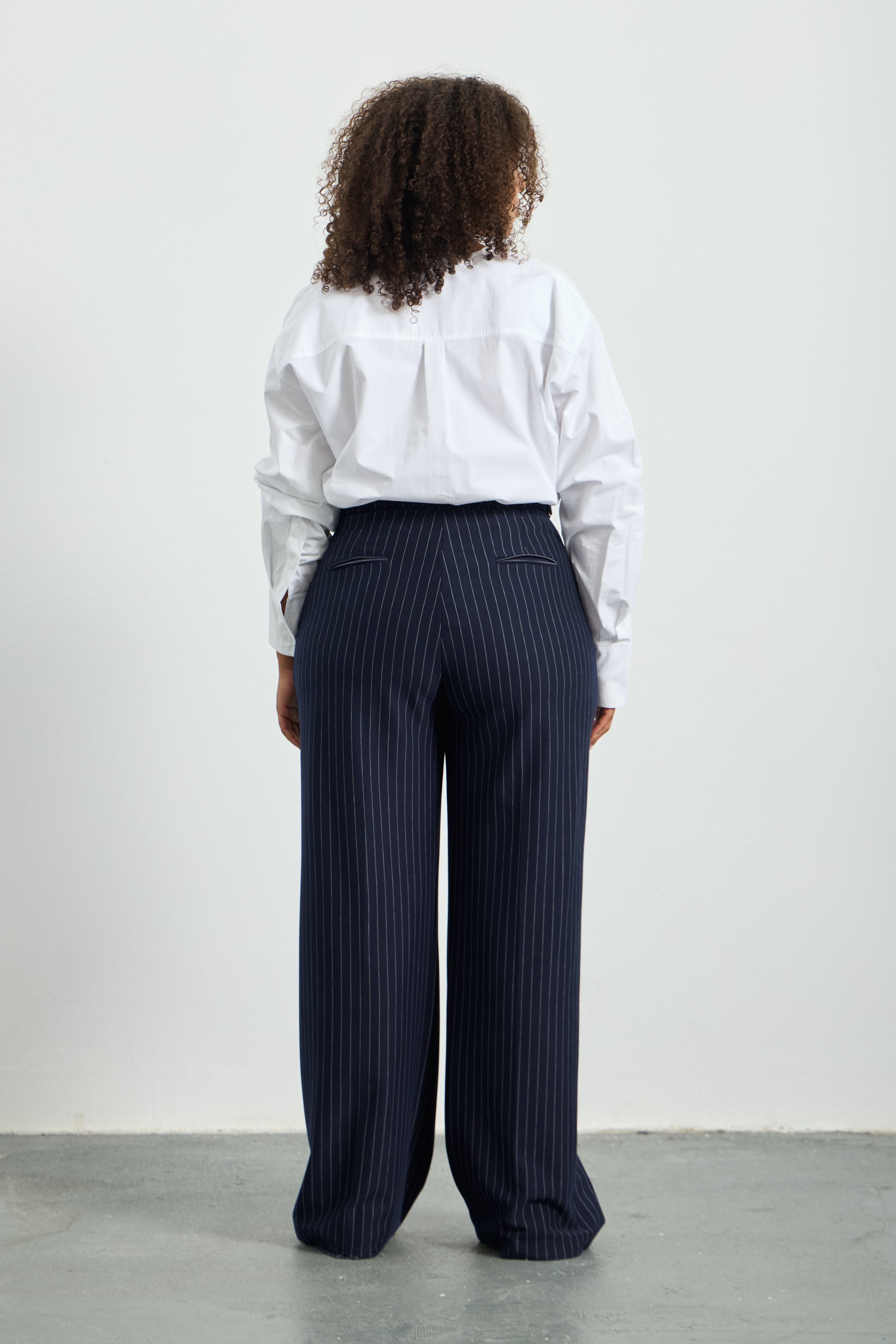 With its elegant look and relaxed fit, the ANNAS Plus Size Navy-White Pants stand out as a key piece for modern and stylish outfits. The pleated palazzo cut creates a flowing and dynamic silhouette, while the buttoned and adjustable buckle waistband ensures a flawless fit around the waist. Featuring side pockets and piped back pockets, this model offers functional use, and its front zipper with metal hook closure blends classic details with modern lines.