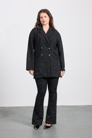 Combining elegance and comfort, the DANTE Plus Size Black Flared Pants are designed to be a go-to piece for your everyday wardrobe with their refined and modern silhouette. The tailored fit offers a perfect shape, while the elastic waistband ensures comfortable wear throughout the day. The flared-leg design elongates the legs for a graceful silhouette, and the tweed texture adds a pleasant feel.