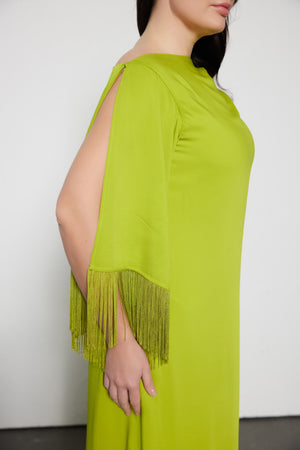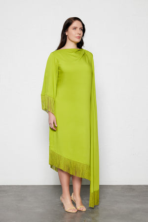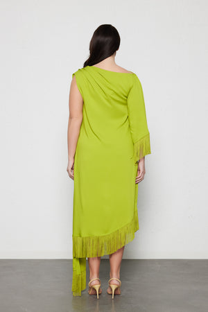 Zarif kesimi ve özgün detaylarıyla kadın büyük beden elbise koleksiyonunda dikkat çeken DESIREE Büyük Beden Yeşil Şal Yaka Elbise, sofistike ve etkileyici bir görünüm sunuyor. Tek omuz tasarımı, asimetrik kesimiyle cesur ve modern bir siluet yaratırken, şal yaka detayı elbiseye şıklık katıyor. Püskül detayları ise hareketli ve dinamik bir hava sunarak tasarımı daha çarpıcı hale getiriyor.