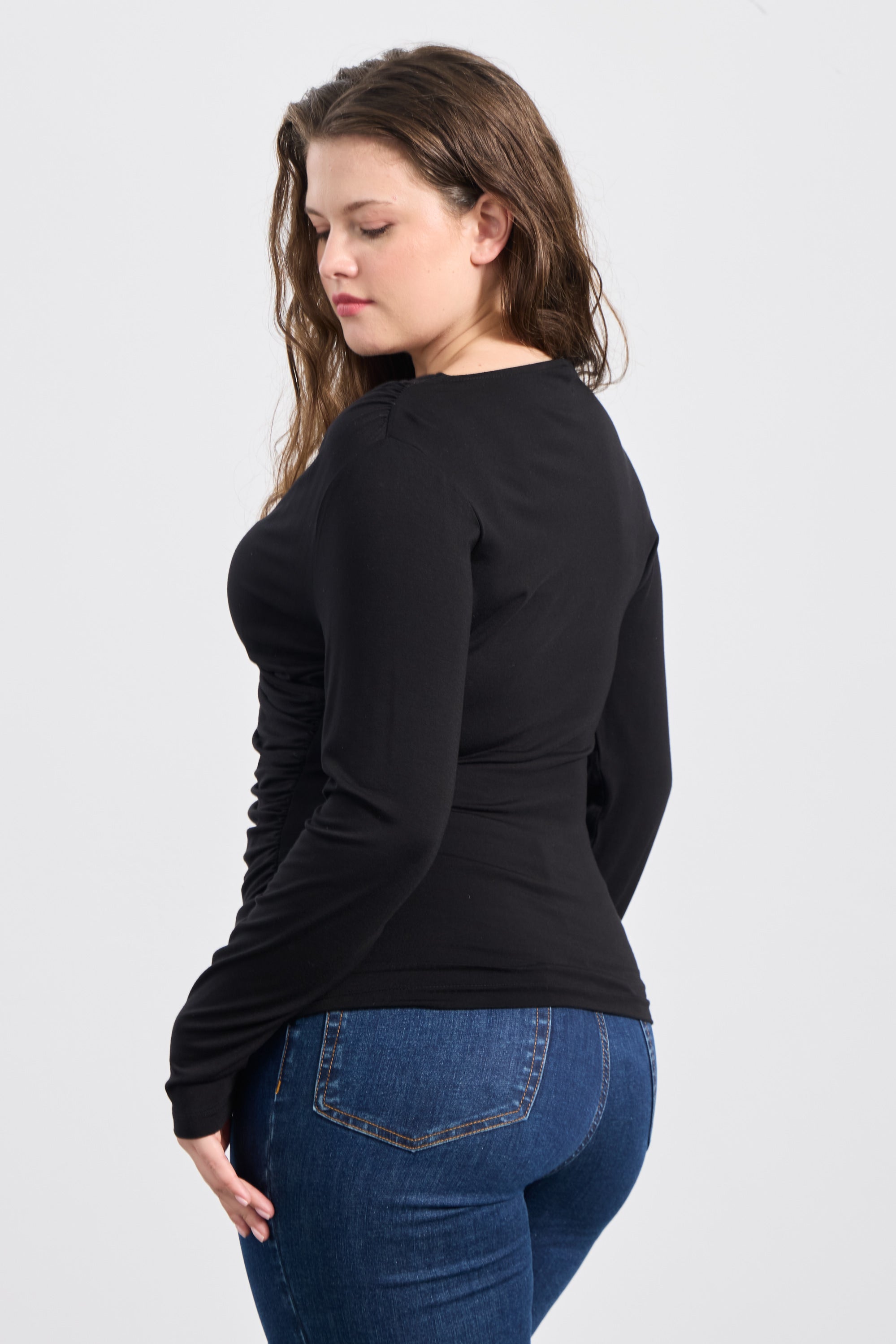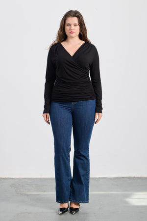 One of the elegant pieces in the plus size women's blouse collection, the FORMAN V-Neck Plus Size Black Blouse stands out with its feminine details. The V-neckline and wrap-style cut create a sleek and flowing silhouette, while the gathered details on the shoulders and side seams add a modern touch. With its long sleeves, this model is suitable for all seasons, offering both comfort and elegance.