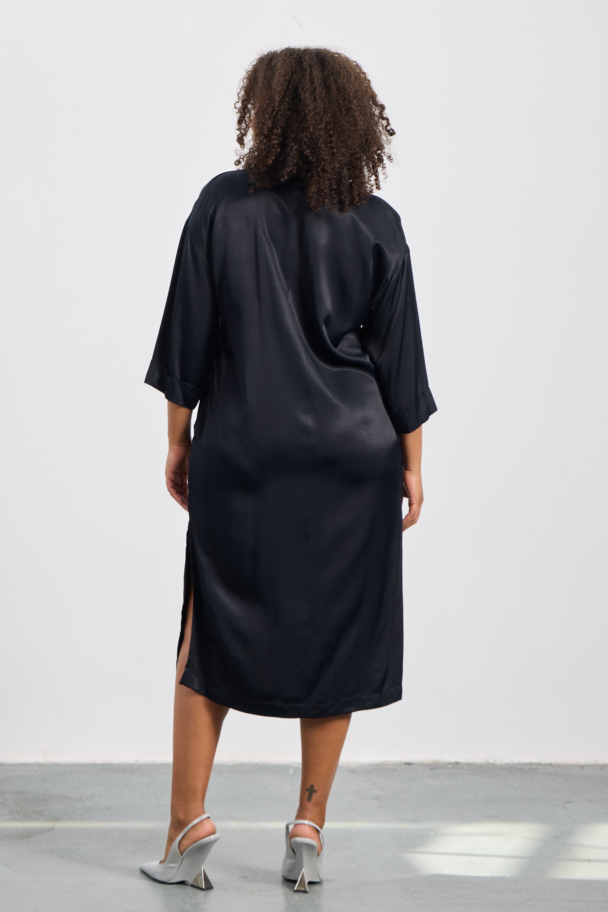 Combining elegance and comfort, the GABRIEL Plus Size Black Satin Dress offers a striking style with its modern details. The V-neckline provides a graceful look, while the three-quarter sleeves offer freedom of movement. Side slit details add a dynamic feel to the dress, and the pockets ensure practical use.
