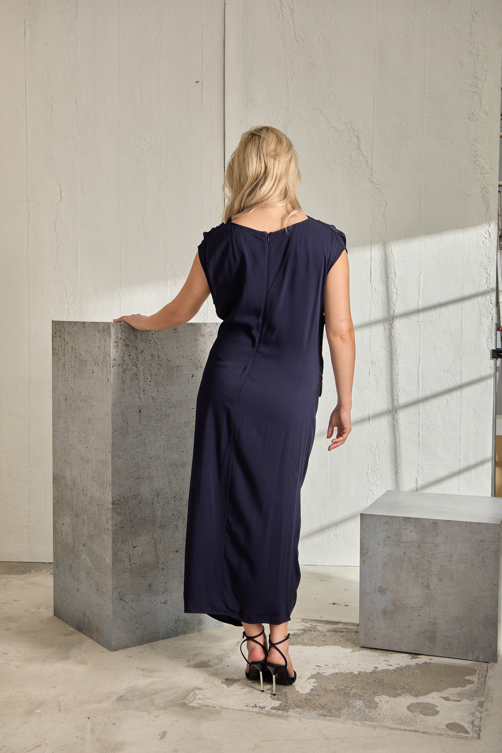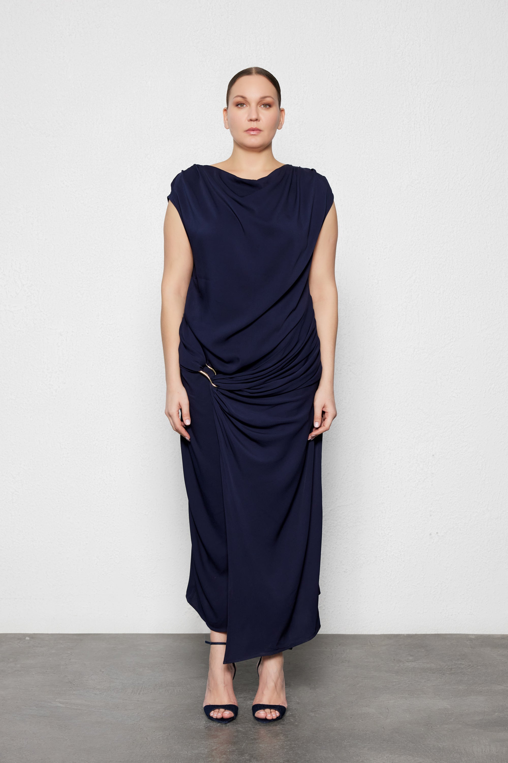 A standout piece in the women's plus-size dress collection, the GISELLE Plus Size Draped Navy Midi Dress impresses with its sophisticated details. The cowl neckline and draped design create a dynamic silhouette. Gold accessory details add elegant touches that complete the chic look, while the sleeveless design offers both comfort and a modern appearance.