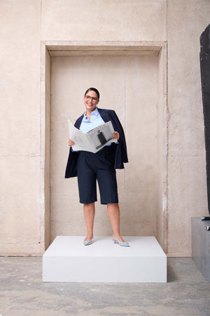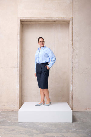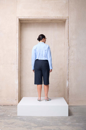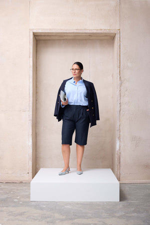 Standing out among plus size shorts that combine style and comfort for summer looks, the ICONIC Plus Size Navy-White Striped Bermuda Shorts draw attention with their modern and refined details. The pleat accents on the front create a classic appearance, while the hidden side seam pockets add functionality. The zipper, button, and metal hook closure ensure a secure fit.