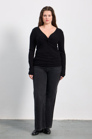 With its modern cut, the INES V-Neck Plus Size Black Blouse offers a stylish and sophisticated look. The fitted silhouette gently highlights the upper body, while the knotted detail at the bust adds a lively touch. Its long sleeves make it suitable for transitional seasons and cooler weather, ensuring comfortable wear.