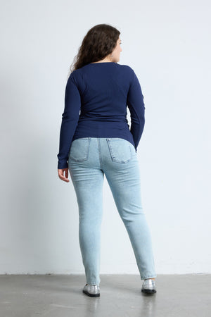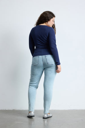 With its elegant details and modern cut, the INES V-Neck Plus Size Navy Blouse combines sophistication and comfort. The fitted silhouette highlights body lines in a balanced way, while the knotted detail at the bust adds movement to the design. Its long sleeves offer comfort during seasonal transitions, and the V-neckline adds a feminine touch.