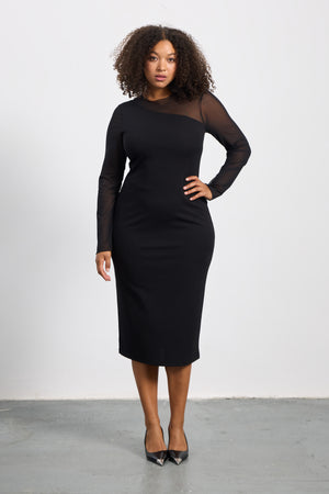 JASMIN Plus Size Black Midi Dress with Sheer Sleeves