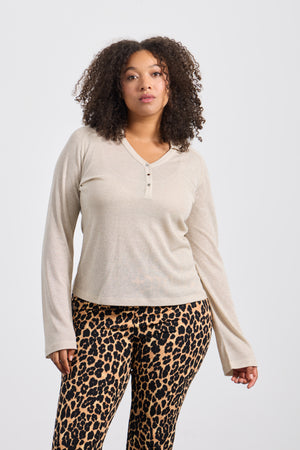 Uzun kollu, polo yaka, gold metal düğmeli, simli, ribana bluz. Büyük beden ve hamile giyime uygundur. Kumaş içeriği : %69 VİSKON %21 SİM % POLYESTER Manken Boyu: 1.76 cm Manken Bedeni: 42