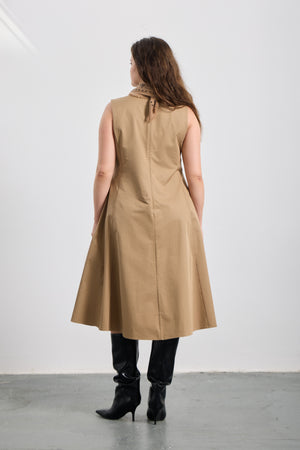 AW 25-26 koleksiyonunun öne çıkan parçalarından Oria, minimal tasarımıyla zarif bir görünüm sunuyor. Yuvarlak yakası ve kolsuz formu sayesinde dengeli bir siluet oluştururken, dikiş detayları elbiseye ince bir karakter kazandırıyor. Arkadan gizli fermuar kapaması pratik bir kullanım sağlarken, astarsız yapısı hafiflik ve rahatlık hissi veriyor.