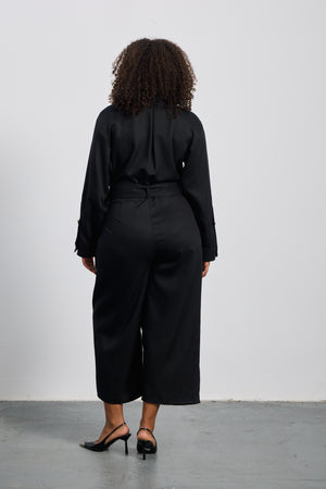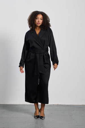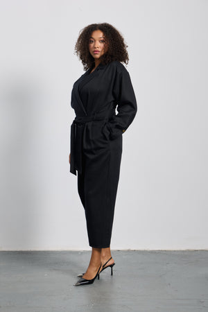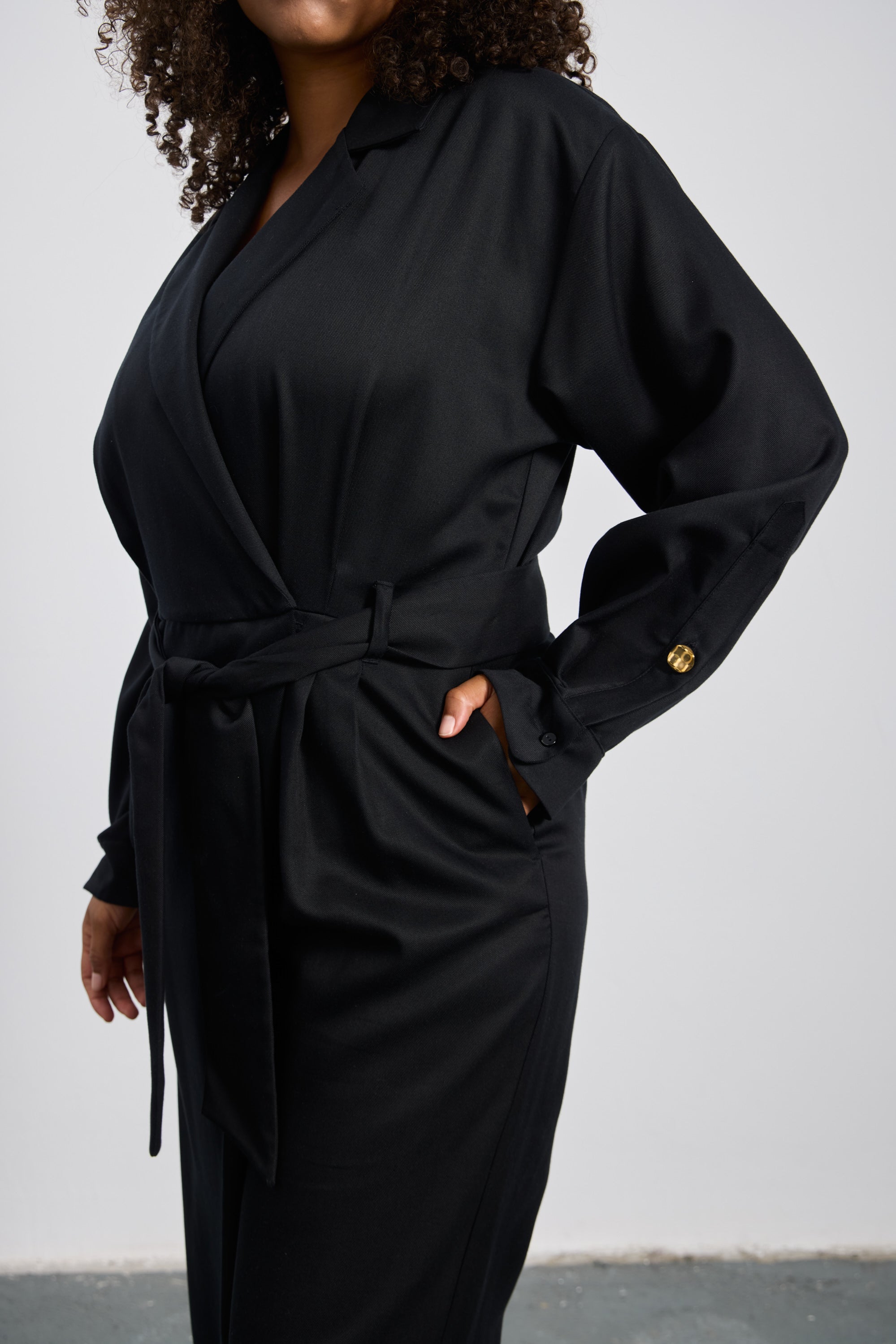 Erkek yaka, uzun kollu, gold düğme detaylı, belde pileli, rahat kalıp, yan cepli, çıkarılabilir kemerli, anvelop dokuma tulum. Büyük beden ve hamile giyime uygundur. Kumaş içeriği : %100 TENSEL Manken Boyu: 1.76 cm Manken Bedeni: 42