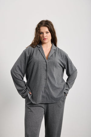 Pegase, a modern piece from the AW 25-26 collection, blends classic lines with comfort. Featuring a men's collar detail and front button closure, it offers a timeless look, while its flexible fabric provides all-day comfort. Its long sleeves and relaxed fit create a balanced silhouette on all body types.