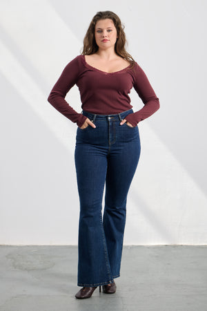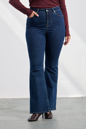 Kalçayı saran, esnek yapıya sahip, ispanyol paça jean pantolon. Büyük beden ve hamile giyime uygundur. Kumaş İçeriği %84 Pamuk %13 Polyamid %3 Elastan. Manken Boyu: 1.76 cm Manken Bedeni: 40
