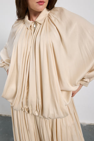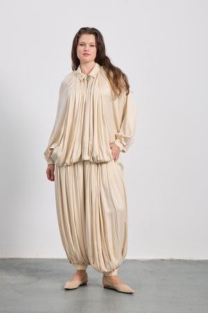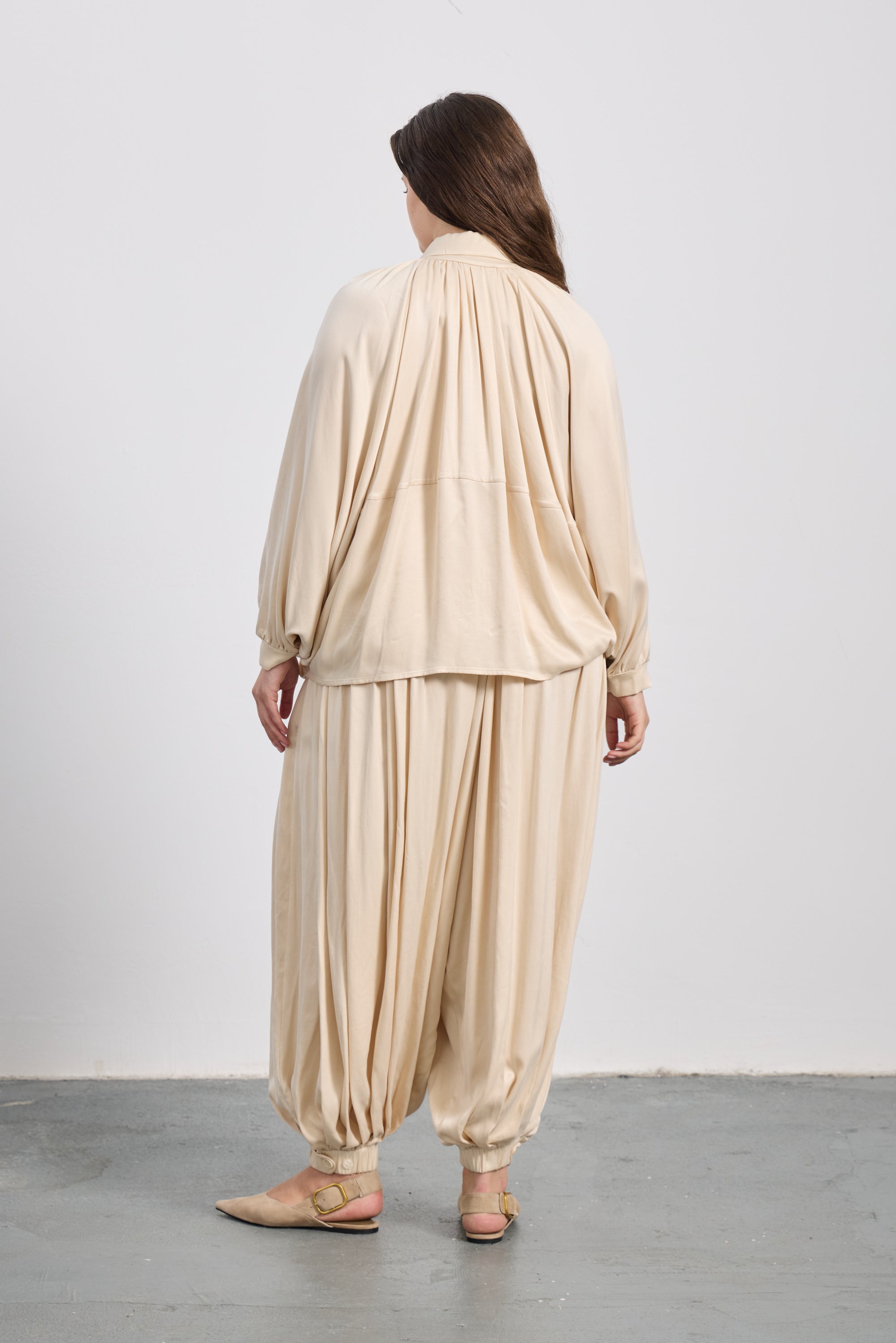 %53 cupro ve %47 viskon karışımı saten kumaşıyla hafif, akışkan ve cilde nazik bir deneyim sunan SERRES, 40-50 beden aralığında sunularak büyük beden giyimde zarafeti ve rahatlığı bir araya getiriyor. Günlük stilinize şıklık katmakla kalmaz, aynı zamanda ofis ya da şehir hayatında da öne çıkan bir tamamlayıcı parça olur. Hamile giyime uygun yapısıyla farklı dönemlerde de konforlu bir alternatif olarak tercih edilebilir.