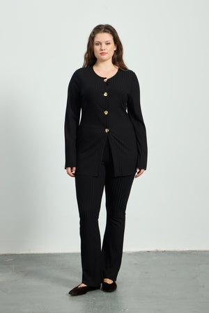 Yuvarlak yaka, üste oturan kalıp, esnek kumaş, uzun kollu, kol ucunda yırtmaç detaylı,gold düğmeli örme bluz. Büyük beden ve hamile giyime uygundur. Kumaş içeriği : %72 VİSKON %25 NAYLON %3 ELASTAN Manken Boyu: 1.77 cm Manken Bedeni: 40-42