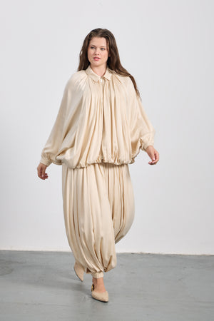 AW 25-26 koleksiyonunun özgün parçalarından Syma, zarif saten dokusu ve rahat kesimiyle modern şıklığı yeniden tanımlıyor. Paçalardaki ayarlanabilir düğmeli bantlar pantolona karakteristik bir görünüm kazandırırken, arka beldeki lastikli yapı gün boyu konfor sağlıyor. Rahat kalıbı sayesinde hem zarif hem de özgür bir siluet sunan bu model, şehir stilinden özel davetlere kadar çok yönlü bir kullanım imkânı veriyor.