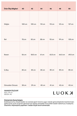 Ürün Ölçü Bilgileri | 40 | 42 | 44 | 46 | 48 | 50 |