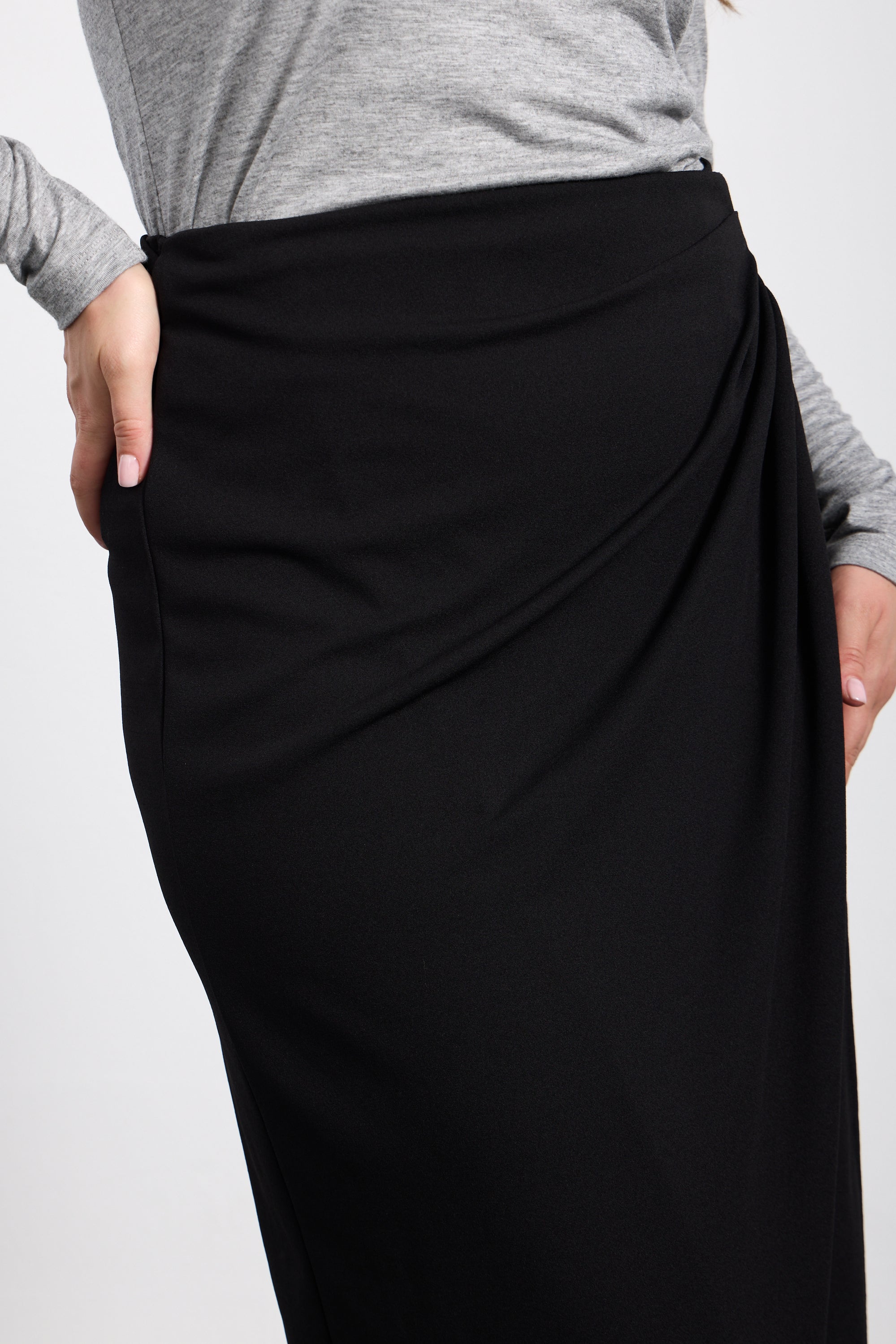 ADISO Anvelop Büyük Beden Siyah Midi Etek Özellikleri; Anvelop kapama, elastik bantlı, drape detaylı asimetrik midi etek. Büyük beden ve hamile giyime uygundur. Kumaş içeriği: %95 POLYESTER %5 ELASTAN Model Boyu: 1.76 cm Model Bedeni: 42