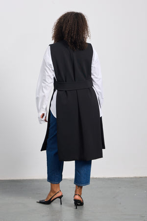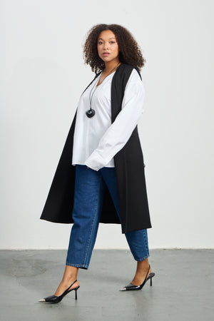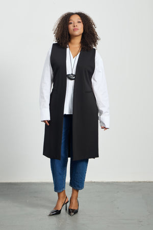 CINDY Büyük Beden Siyah Uzun Yelek Özellikleri; V yaka, astarlı, kolsuz ve yırtmaçlı klasik yelek. Büyük beden ve hamile giyime uygundur. Kumaş içeriği: %95 POLYESTER %5 ELASTAN Model Boyu: 1.76 cm Model Bedeni: 46