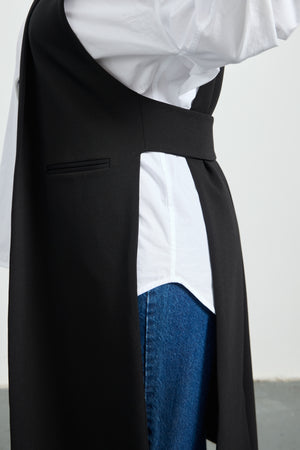 V yaka, astarlı, kolsuz ve yırtmaçlı klasik yelek.