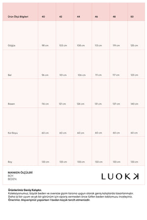 | Göğüs (cm) | 100 cm | 105 cm | 110 cm | 116 cm | 122 cm |