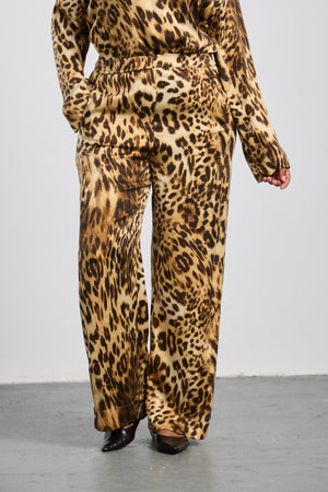 FINGSTON Büyük Beden Leopar Desenli Saten Pantolon