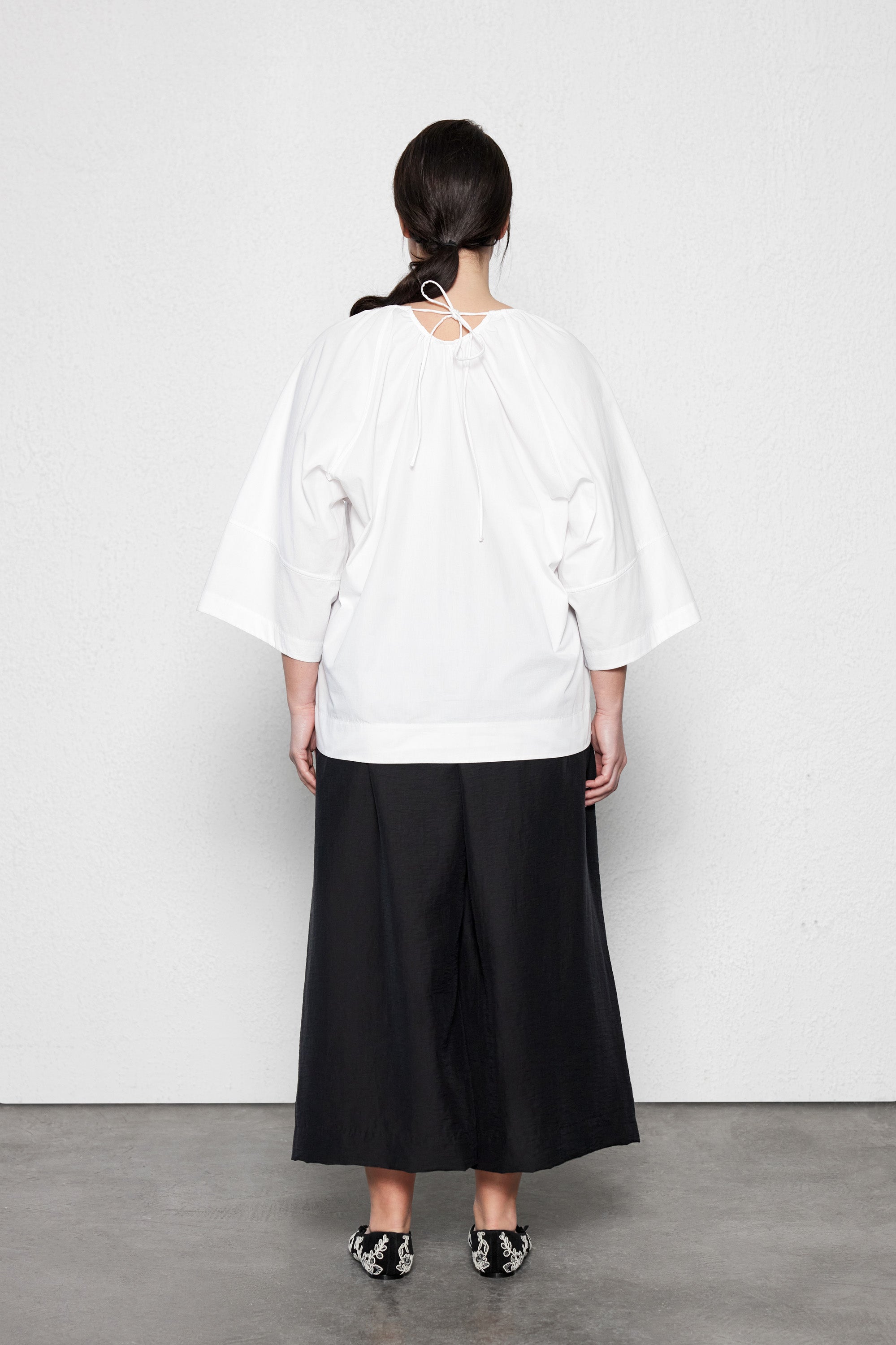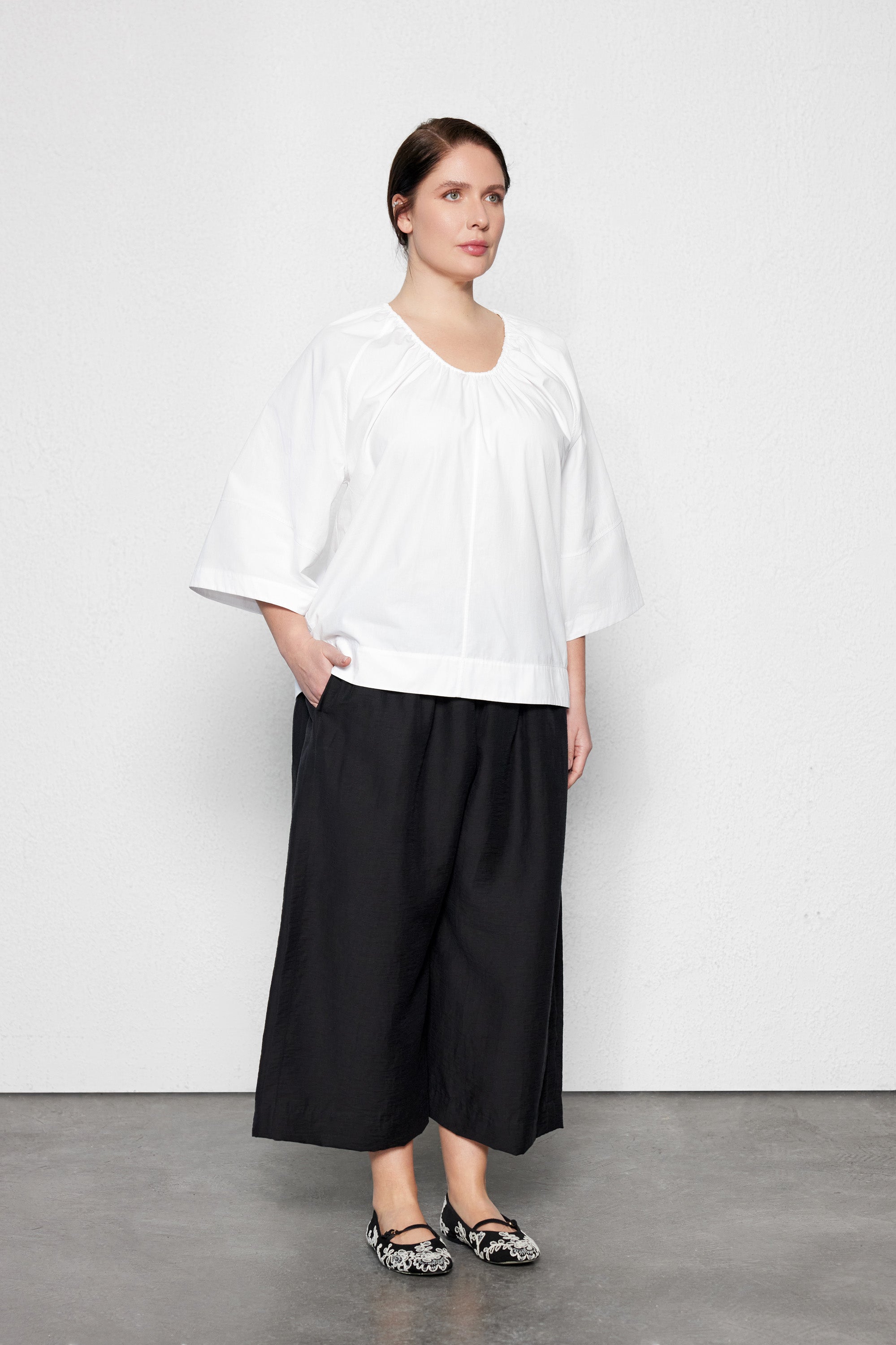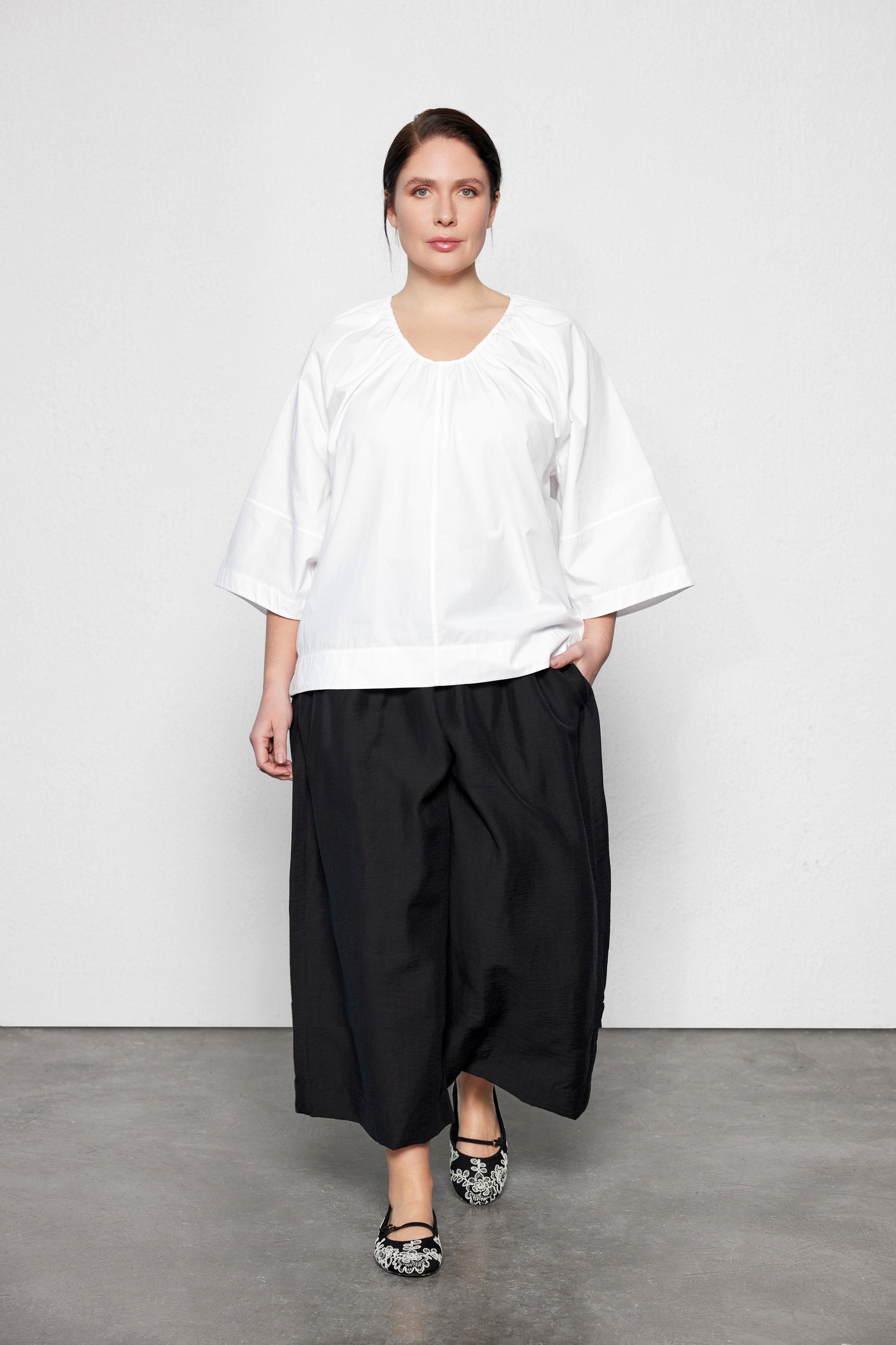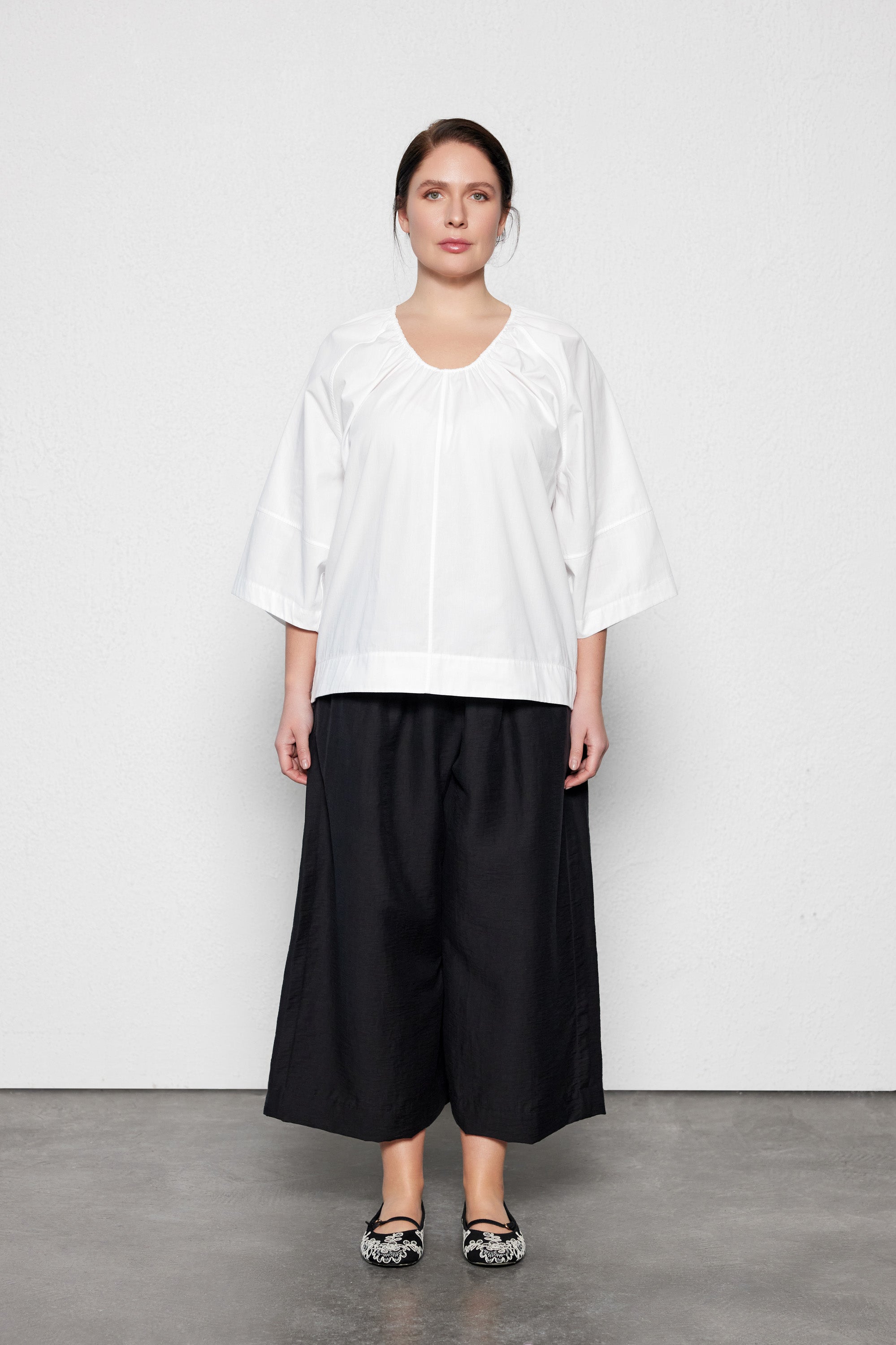 Zarif tasarımıyla bayan büyük beden bluz koleksiyonunda öne çıkan FLAT Büyük Beden Beyaz Poplin Bluz, rahat kesimi ve şık detaylarıyla dikkat çekiyor. Büzgülü U yakası, ensede yer alan bağlama detayı hareketli ve özgün bir görünüm sunuyor. Truvakar kollu yapısı, klasik ve modern çizgileri bir araya getirirken, kalın etek ucu dikişi modeli tamamlayan estetik bir dokunuş sağlıyor.