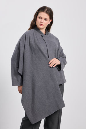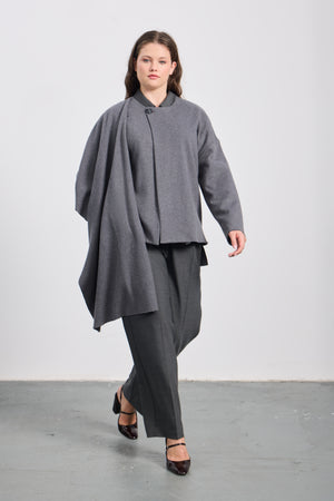 Asimetrik, şal detaylı, uzun kollu, yuvarlak yakalı, yan yırtmaçlı asimetrik etek, önü kruvaze düğme iliklemeli ceket.
