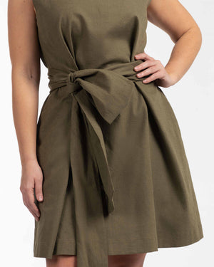 FLOWY Yuvarlak Yaka Pamuklu Büyük Beden Mini Keten Elbise Haki