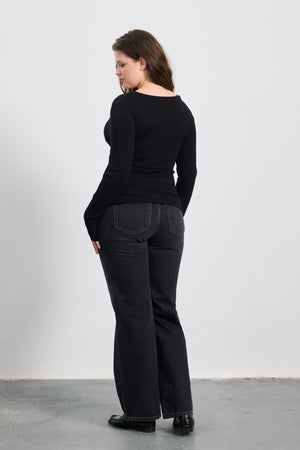 INES V Yaka Düğüm Detaylı Uzun Kollu Büyük Beden Bluz Siyah