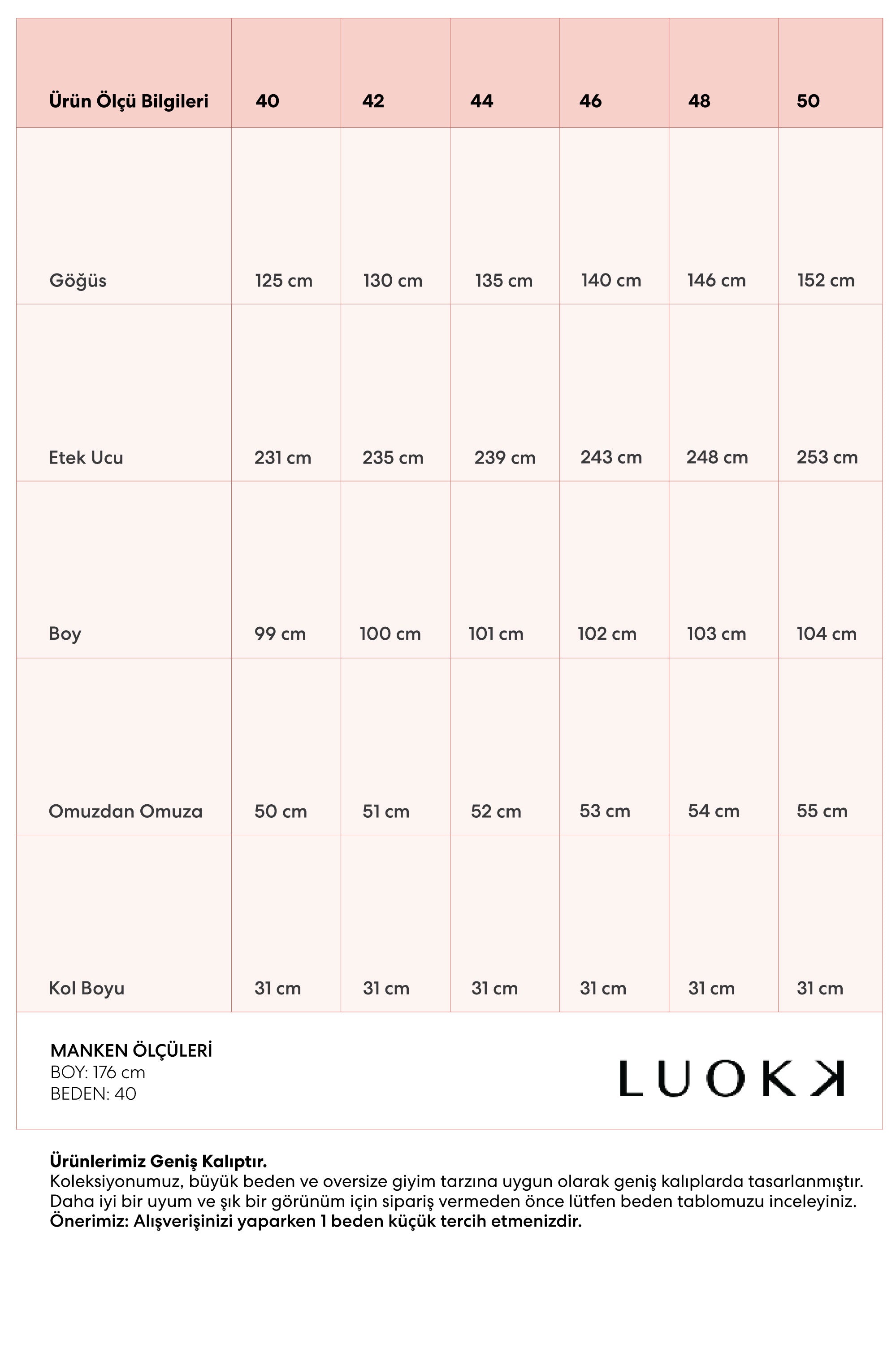 Ürün Ölçü Bilgileri | 40 | 42 | 44 | 46 | 48 | 50 |