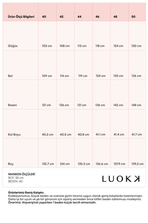 | Ürün Ölçü Bilgileri | 40 | 42 | 44 | 46 | 48 | 50 |